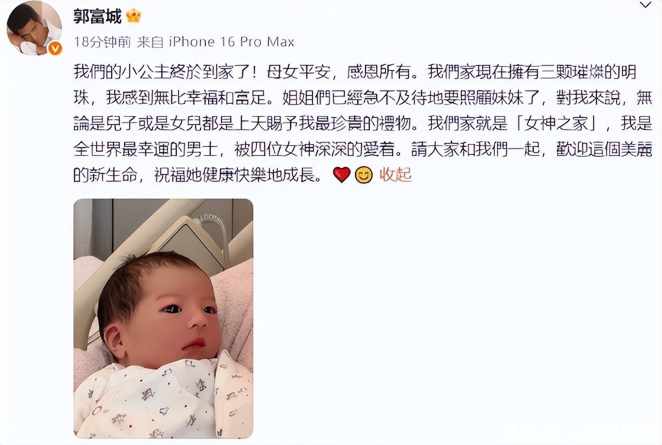 那份喜悦跟寻常的父亲一样,几个小时后他更是在社交平台官宣,配文充满了爱意: